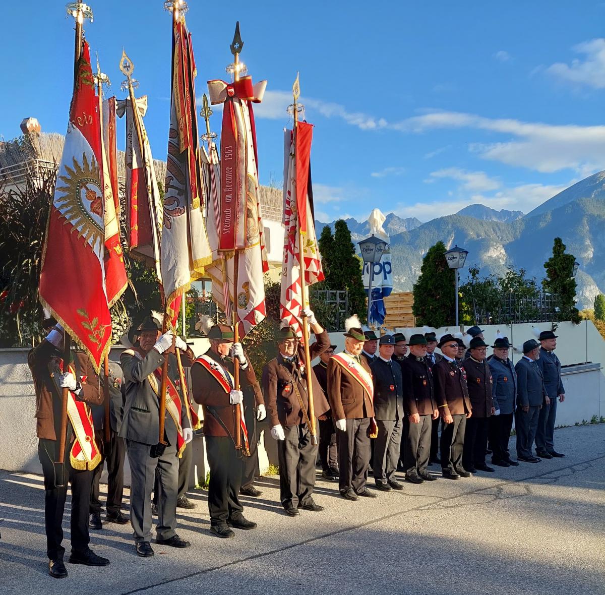 Die beiden Fahnenabordnungen der Kameradschaft Hall (alte und neue Fahne) beim Fahnengruß kurz nach der übergabe der Fahnenbänder welche von Christa Sprenger und Eva Aichner übergeben wurden.