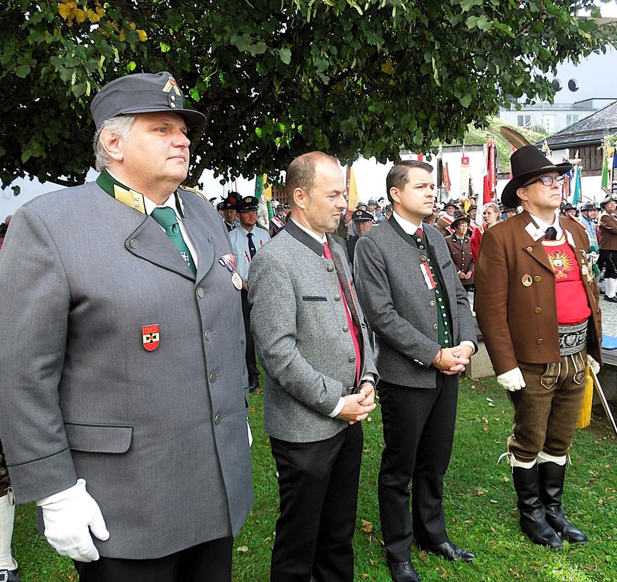 Kranzniederlegung: Vor dem Gefallenendenkmal haben TKB-Vizepräsident Roman Burgstaller, Nationalrat Landeslandwirtschaftskammerpräsident Josef Hechenberger, Bezirkshauptmann Kurt Berek und Schützen-Bataillonskommandant Manfred Schachner Aufstellung genommen.