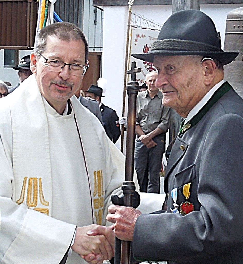 Militärpfarrer Christoph Gmachl-Aher gratulierte dem Obmann der Kameradschaft Kundl, Altbürgermeister und Ehrenbürger der Marktgemeinde Kundl Walter Doblander zum Pilgerstab, der ihm am Wallfahrtsort Mariastein überreicht wurde. Doblander hält diese Gelöbiswallfahrt in Treue hoch. Der Kriegsteilnehmer ist 98 Jahre alt.