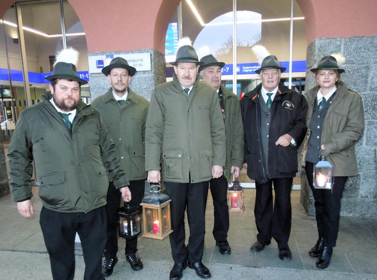 Unser Bild zeigt v. li. die Kameraden Christoph Gürtler, Stefan Silberberger, Kameradschaftsobmann Josef Werlberger, Herbert Tipotsch, TKB-Ehrenpräsident Ehrenobmann Hermann Hotter und TKB-Landesschriftführerin Julia Mussner beim Abholen des Friedenslichtes am Hauptbahnhof Wörgl. Foto: TKB/Martin